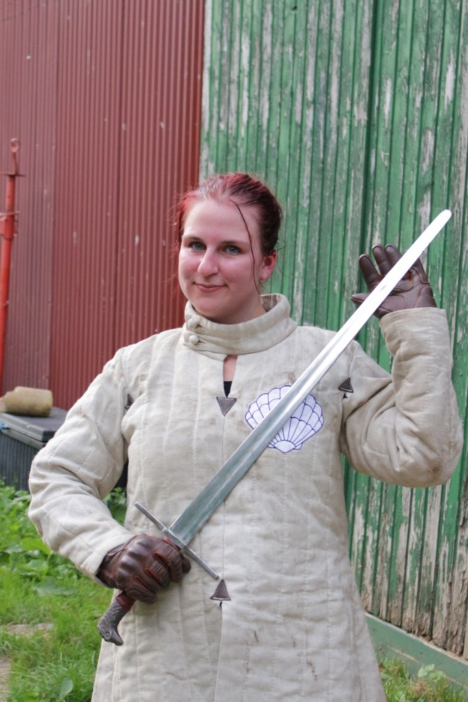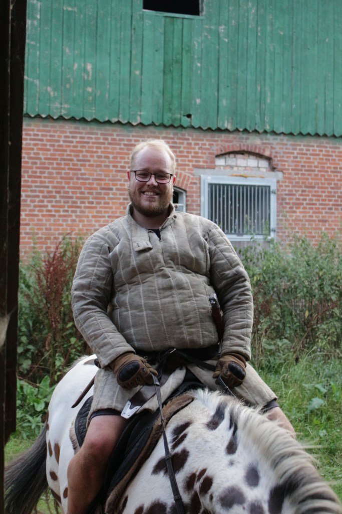 Man muss sich vorstellen: da Fotos gemacht wurden, hatten sich die Leute auch in ihre mittelalterliche Gewandung geschmissen. D.h. neben Hemd und Hose kam bei jedem Kämpfenden noch mindestens der Gambeson dazu. Ein Gambeson (kurz: Gambi) ist eine wattierte Weste, welche normalerweise unter der Rüstung oder dem Kettenhemd getragen wird. Also gar nicht so unwichtig, wenn man mit Schwertern hantiert.Nach kurzer Zeit waren alle durchgeschwitzt und ziemlich K.O., aber trotzdem war der Spaß sehr groß. Immer wieder während des Trainings hatten wir Zuschauer: Von der Hofbetreiberin bis hin zu ein paar Jugendlichen, die nach ihrem Reittraining geblieben sind.